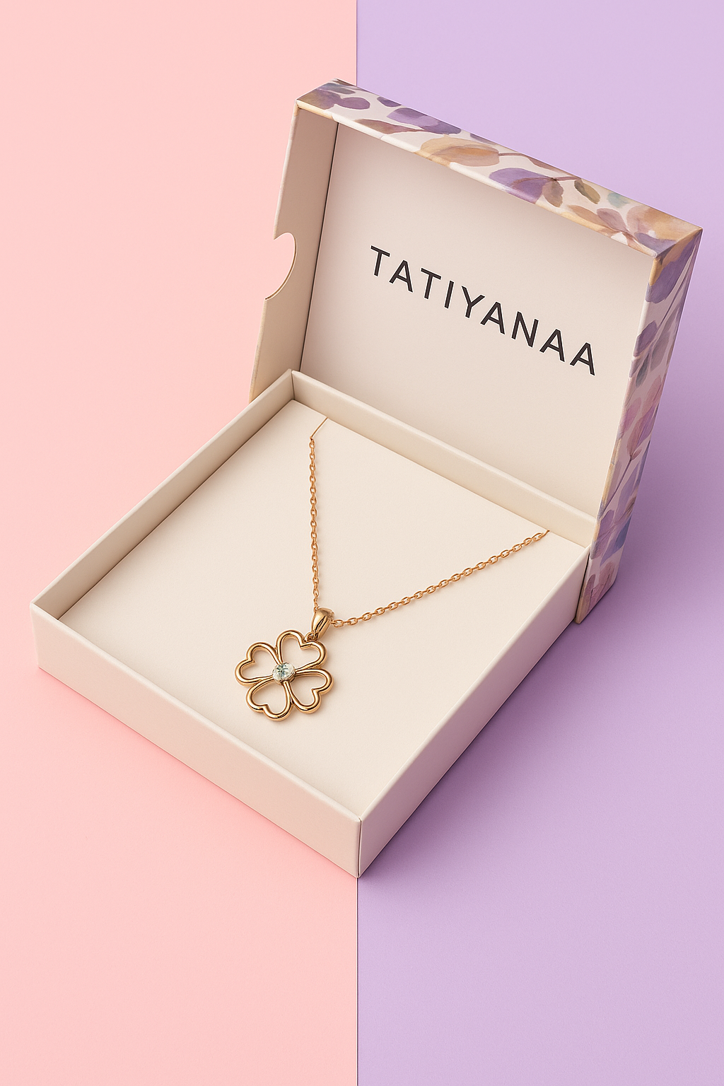 Bring luck and elegance to your style with this beautifully crafted clover pendant necklace from TATIYANAA. Featuring a delicate gold chain and an open-petal four-leaf clover design, this piece is accented with a sparkling crystal at its center for a touch of brilliance. Perfect for everyday wear or as a meaningful gift, the necklace symbolizes luck, love, and positivity.